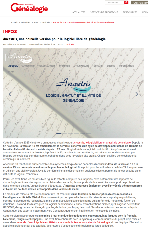 Revue Française de Généalogie de 24 de Dezembro de 2025, anunciando o lançamento do Ancestris 13.