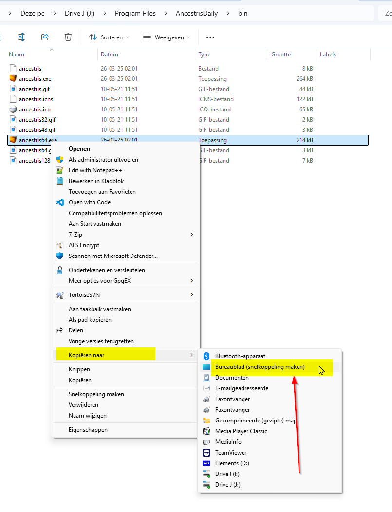 Daar doen we een rechtsklik op het bestand "ancestris64.exe". (Heb je een ouder windows systeem, dus geen 24-bits systeem, dan moet je misschien "ancestris.exe" gebruiken.) In het popup-menu kiezen we geheel onderaan, eerst voor: "Meer opties weergeven". Pas als we dat gedaan hebben krijgen we: