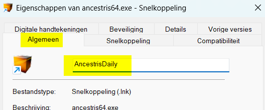 Op dit tabblad zien we de naam van de snelkoppeling, hier was dat eerst "ancestris64.exe" (zie links). Dit veranderen we in een naam naar keuze, hier "AncestrisDaily". Daarna gaan we naar tabblad "Snelkoppeling". |