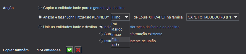 Independentemente da acção escolhida, será feita uma cópia das entidades de uma genealogia para a outra. Portanto, essa escolha tem como objectivo especificar se a cópia deve ser enriquecida com uma ligação entre entidades ou com uma união da entidade principal seleccionada.