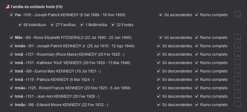 - Por pré-definição, os tipos de entidades actualmente seleccionados nas respectivas árvores genealógicas no momento do início da ferramenta estão seleccionados.