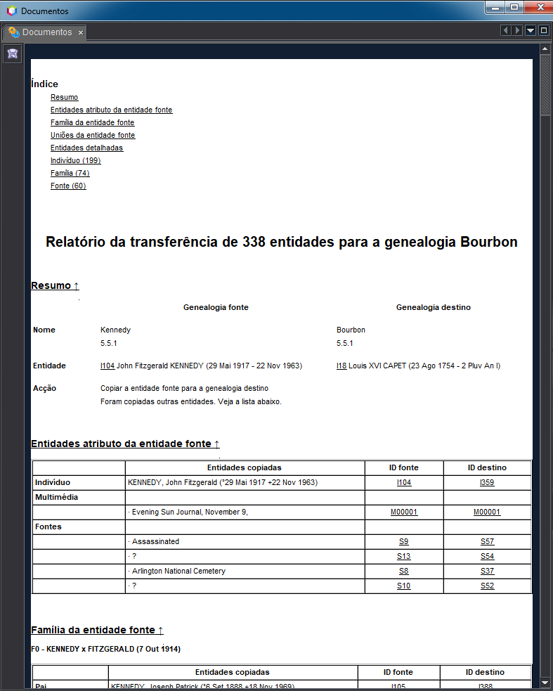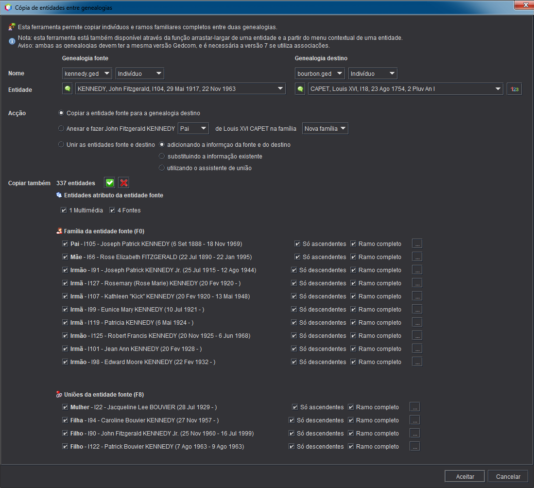 De acordo com as selecções acima, várias entidades podem ser transferidas da genealogia de origem para a genealogia de destino.