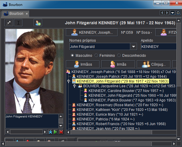 No nosso exemplo, se quiser verificar visualmente se John Kennedy foi copiado para a árvore genealógica Bourbon, pode clicar no seu ID de destino no relatório e obterá a imagem abaixo, onde estamos a editar a genealogia Bourbon (nome no separador) e podemos ver John Kennedy com a sua fotografia no editor Cygnus. Também podemos ver que toda a família foi copiada e integrada na genealogia Bourbon.