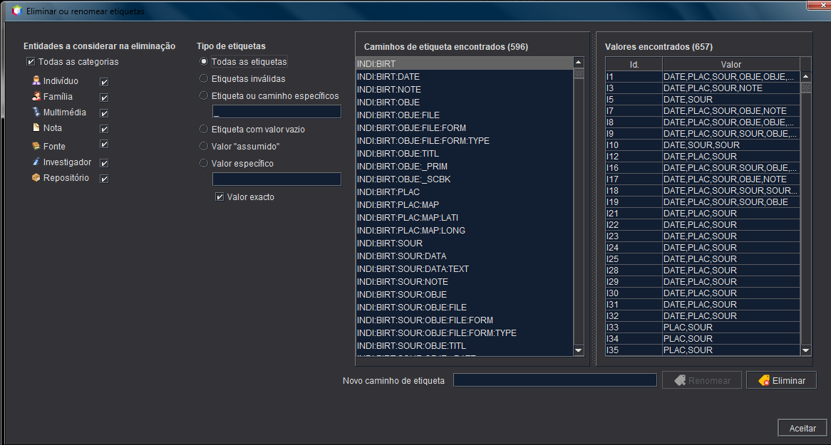 - Se alterar apenas a etiqueta, ou seja, a última parte do caminho da etiqueta, a etiqueta das propriedades será renomeada. Pode utilizá-la para alterar um baptismo para nascimento (CHR para BIRT) ou um evento FACT para EVEN, por exemplo.