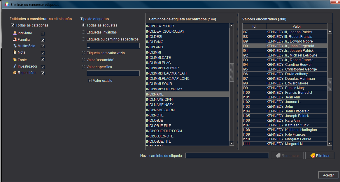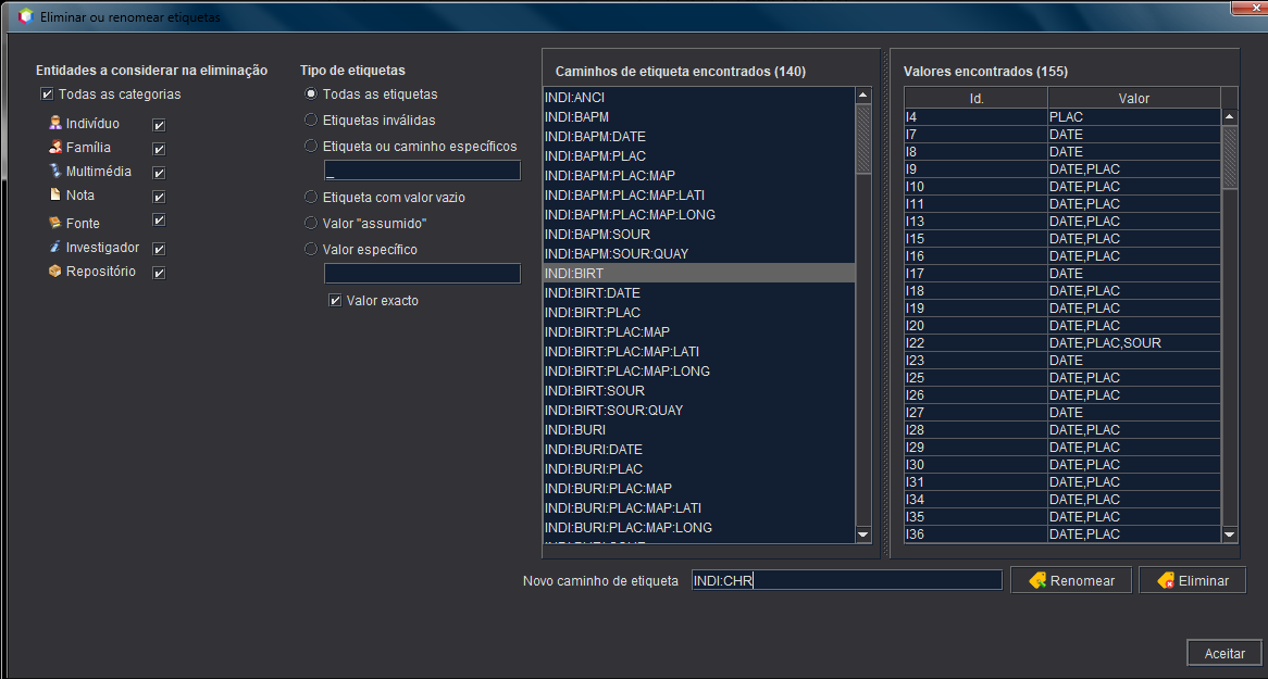 Na janela abaixo, seleccionámos todas as entidades, todos os caminhos de etiqueta e, em seguida, escolhemos INDI:BIRT.