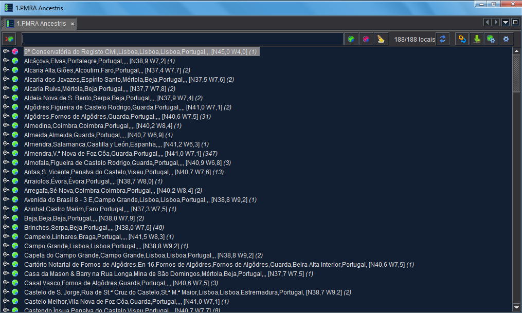 A lista de locais permite editar todos os locais de uma genealogia, geo-localizá-los, combiná-los e verificar se foram correctamente inseridos e organizados de forma coerente.