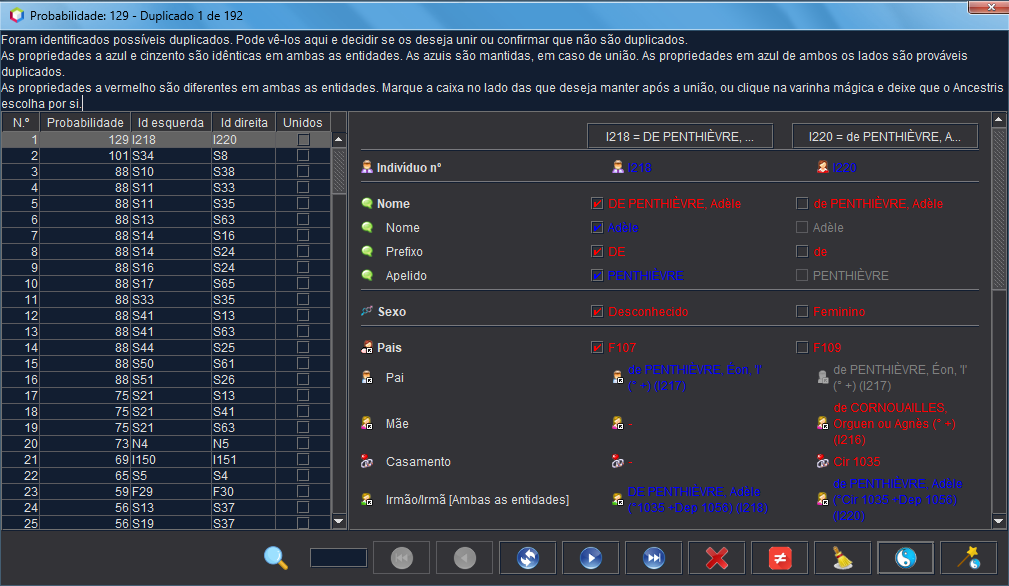 O Ancestris elabora então uma lista de potenciais duplicados com base nesta pontuação, com a intenção de lhe dizer: "Embora não seja certo, dadas as semelhanças nas informações entre estas duas pessoas, é possível serem duplicados. E este é o nível de confiança entre elas". Depois, cabe-lhe a si decidir se quer unir ou descartar a semelhança.