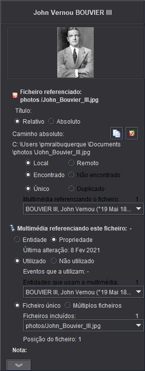 - Propriedade, porque a multimédia não pode ser reutilizada por outras entidades da genealogia; se modificar o nome doe um ficheiro, terá de o alterar em várias propriedades;