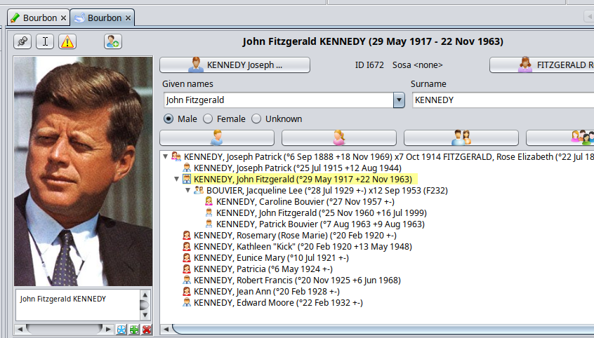 As you can see in the image below, we are editing the Bourbon genealogy and we can see John Kennedy with the picture. We also can see that all the family was copied across as well and integrated into the Bourbon genealogy.