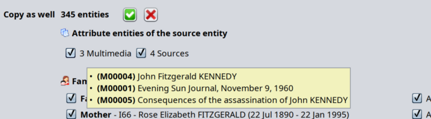 In these situation, the entities of the of the "Copy as well" section are unselected by default. Indeed, copying entities within a given genealogy is likely to generate duplicates, so it is not recommended, unless you have a good reason to do so. If no entities are selected, no copy will be made. In case you really want to do it, the copy action remains possible.
