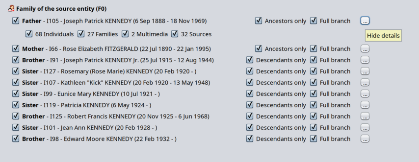 When ancestors, descendants or branches are included in the copy, Ancestris will add the corresponding entities in the details shown.