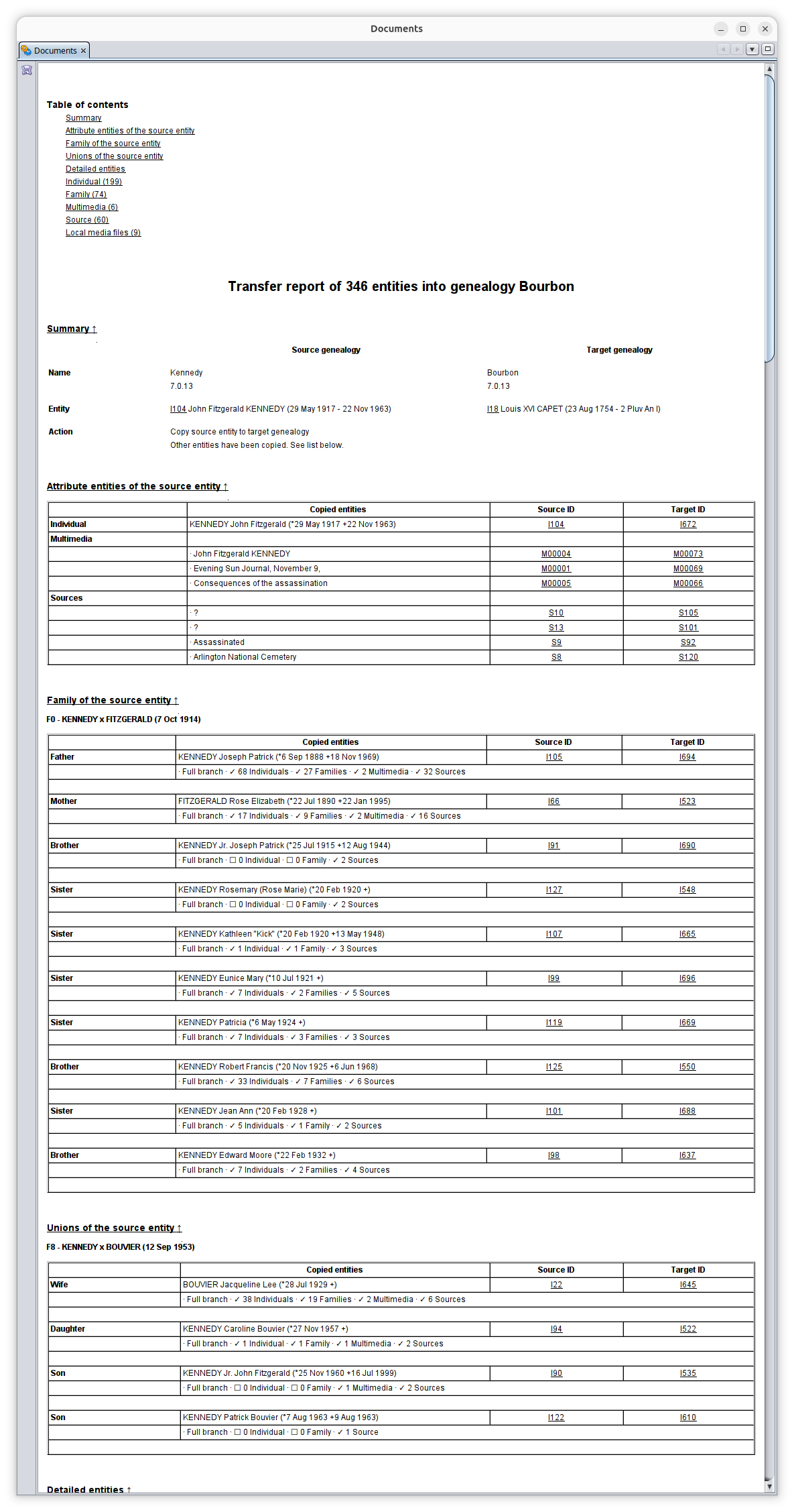 In our example, if you want to check visualy that John Kennedy was copied to the Bouron genealogy, we can click on its target ID in the report and we get this.