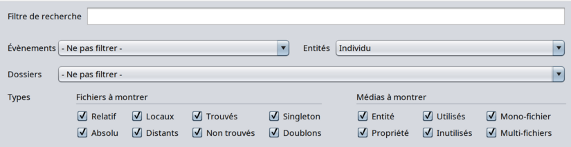 Le filtre de recherche vous permet de saisir une chaîne de caractères qu'Ancestris utilisera pour faire correspondre le titre, le nom du fichier ou l'entité hébergeant des fichiers multimédias.