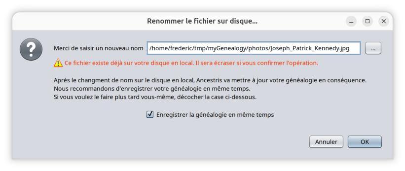 - Ancestris vous proposera d'enregistrer votre généalogie en même temps, car les changements de nom de fichier sur le disque ne peuvent pas être annulés automatiquement et vous ne souhaitez probablement pas que les liens soient rompus. Vous pouvez également choisir de ne pas enregistrer la généalogie immédiatement et de le faire plus tard, une fois que plusieurs fichiers auront été renommés.