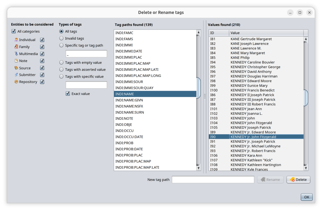 In the window below, we select all entities, all tag paths, and choose INDI:NAME.