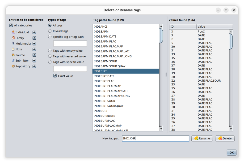 In the window below, we select all entities, all tag paths, and choose INDI:BIRT.