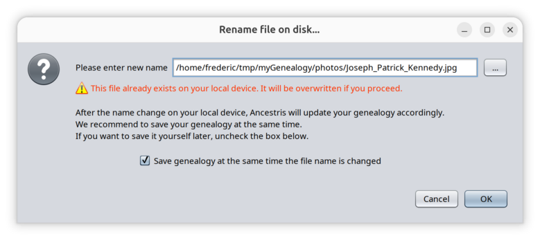 - Ancestris will update the genealogy accordingly to maintain the link between your genealogy data and the fiels on disk.