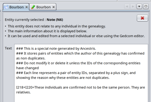 - Special note for all non duplicates: this is where Ancestris stores all your confirmations that two entities are not duplicates.