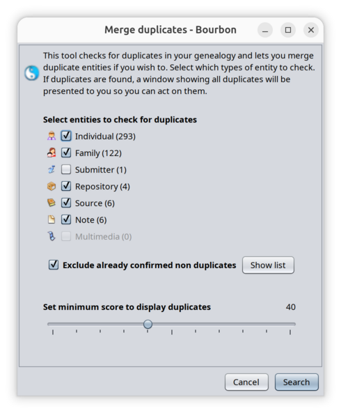 - You need to try several thresholds for your genealogy until you're satisfied that all duplicates displayed are mostly real duplicates, while still showing a few ones that are not, just to make sure you've got them all.