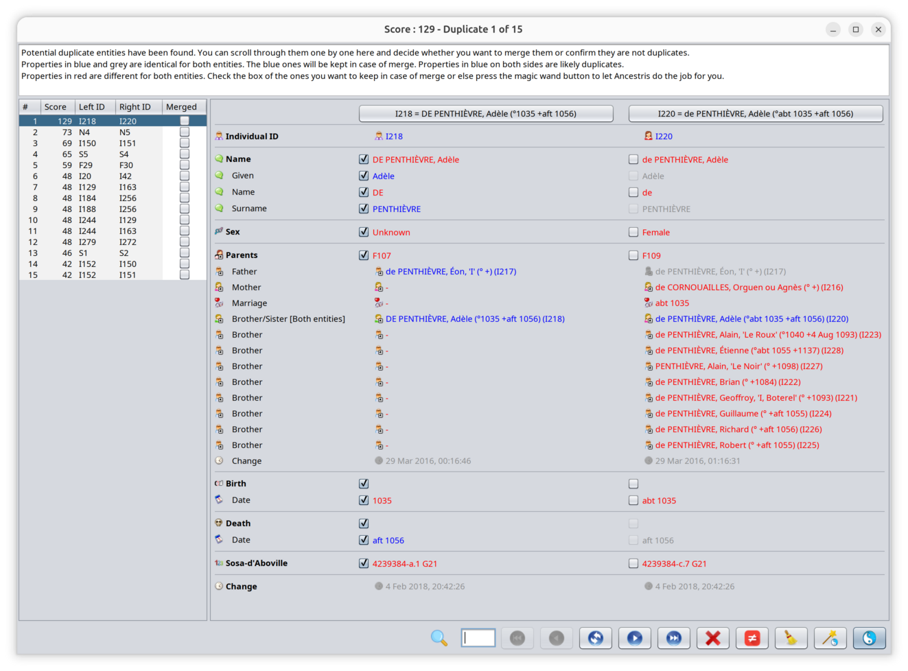 Then Ancestris displays the Merge window with a list of potential duplicates among which will be the pair of two entities you chose and its corresponding score of being the same entity, which can be 0.